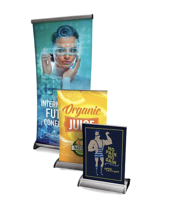 We offer Tabletop Retractable displays and Fabric Tube displays: